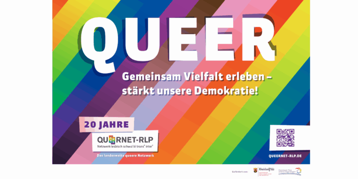 Anlässlich seines 20jährigen Jubiläums startet QueerNet Rheinland-Pfalz, das landesweiten Netzwerk queerer Vereine und Initiativen in Rheinland-Pfalz, ab heute und in den nächsten Wochen eine Plakatkampagne. An Standorten in Mainz, Zweibrücken, Trier, Wittlich, Andernach, Koblenz, Kaiserslautern und Landau hängen – vor dem Hintergrund der Regenbogenfahne – Großplakate mit der Botschaft: QUEER Gemeinsam Vielfalt…