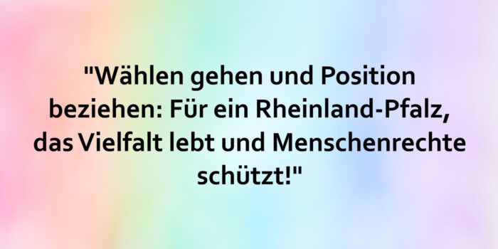 Mehr als 40 landesweite und regionale Organisationen und Initiativen aus Rheinland-Pfalz haben einen gemeinsamen Aufruf zur Landtagswahl am 22. März veröffentlicht. Darin appellieren sie an die wahlberechtigten Rheinland-Pfälzer*innen, vom Privileg des Wahlrechts Gebrauch zu machen und mit ihrer Stimmabgabe Position für ein Rheinland-Pfalz zu beziehen, das Vielfalt lebt und Menschenrechte schützt. Initiiert wurde der Wahlaufruf…