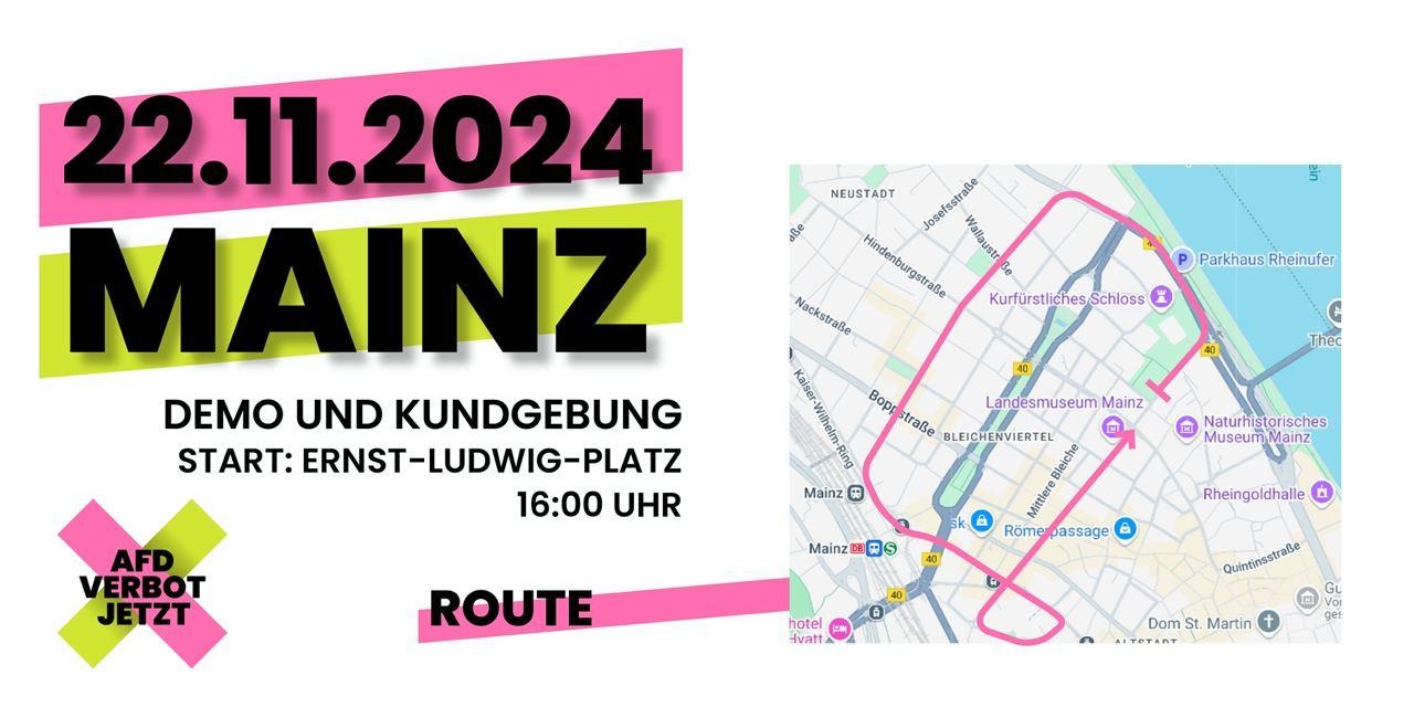 Machen wir den Weg frei für ein AfD-Verbot! Komm zur Demo am Freitag, 22.11. um 16 Uhr (Start: Ernst-Ludwig-Platz, 55116 Mainz) und zeig deine Unterstützung dafür, dass der Bundestag endlich dafür stimmt, dass das Verfassungsgericht ein Verbot der AfD prüft.
