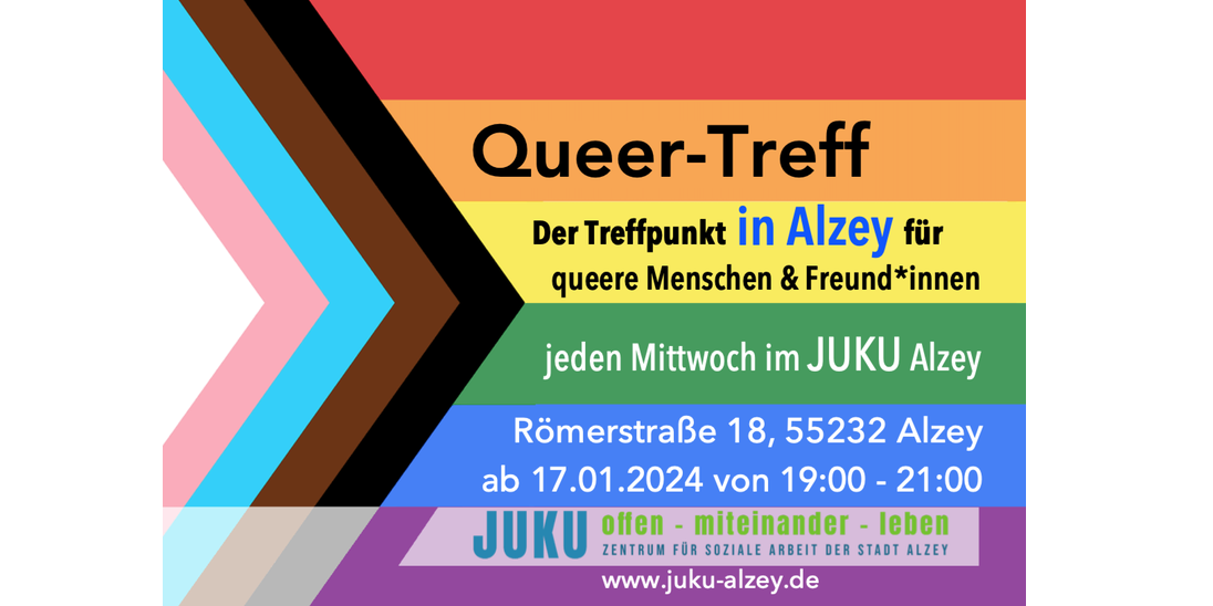Ab dem 17.01. öffnet das JUKU Alzey (Römerstr. 18, 55232 Alzey, Kreis Alzey-Worms) jeden Mittwoch um 19:00 Uhr die Türen für den ersten Alzeyer Treffpunkt für junge queere Menschen und ihre Freund*innen. „Bei uns könnt ihr euch austauschen, entspannen, Aktionen planen, Musik hören, Billard, Tischkicker und Darts spielen. Außerdem unterstützen wir euch bei individuellen Themen oder begleiten und vermitteln euch zu Fachstellen.“